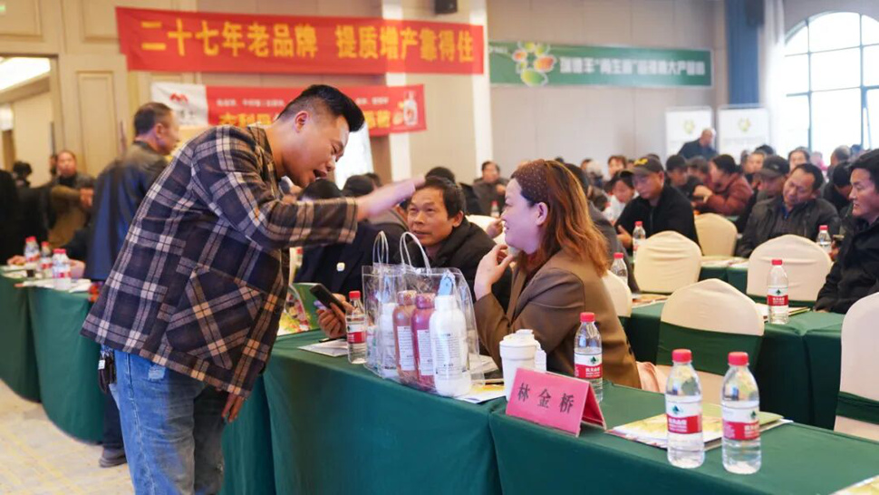 除了台上的技术分享,台下的互动同样火热。种粮大户对“靠得住”秧苗肥套装和“靠得住”水稻叶面肥套装表现出了浓厚的兴趣,与现场技术人员交流,咨询氛围十分热烈。