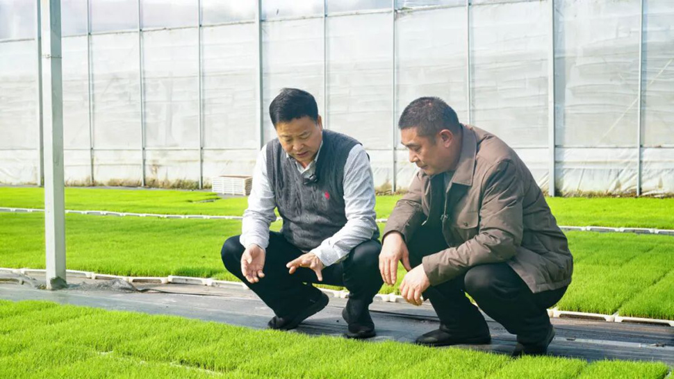 在合作社集中育秧基地,康望才董事长仔细察看了早稻秧苗长势。据介绍,该基地建有3104平方米的标准化育秧大棚,采用集中育秧模式,可容纳24000盘秧盘,能够满足周边800亩大田的用秧需求。目前,秧苗已进入两叶一心关键生长期,长势整齐均匀,即将开展第一次“靠得住”秧苗肥喷施作业。