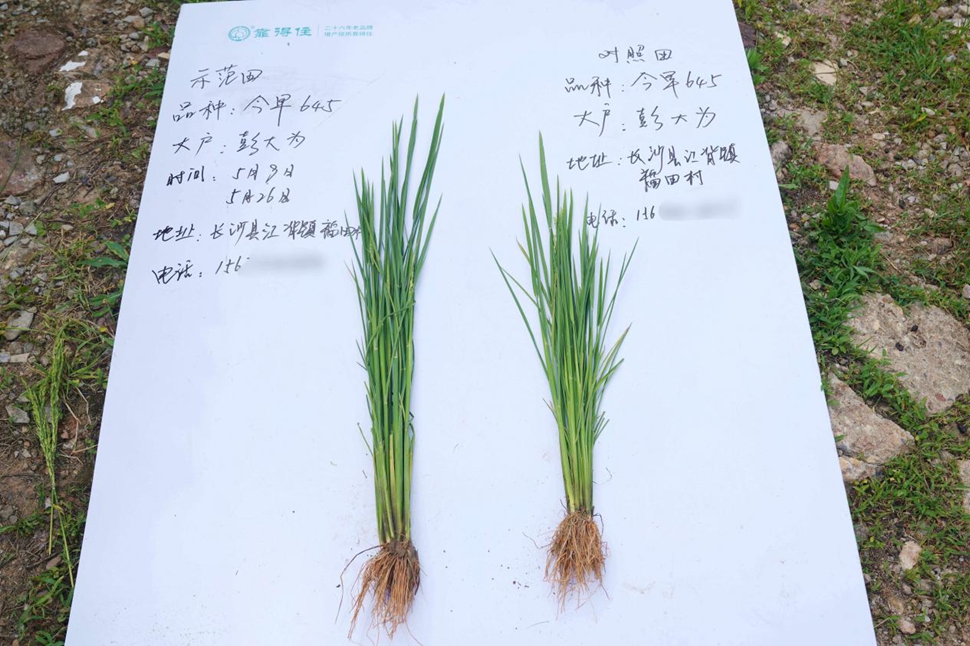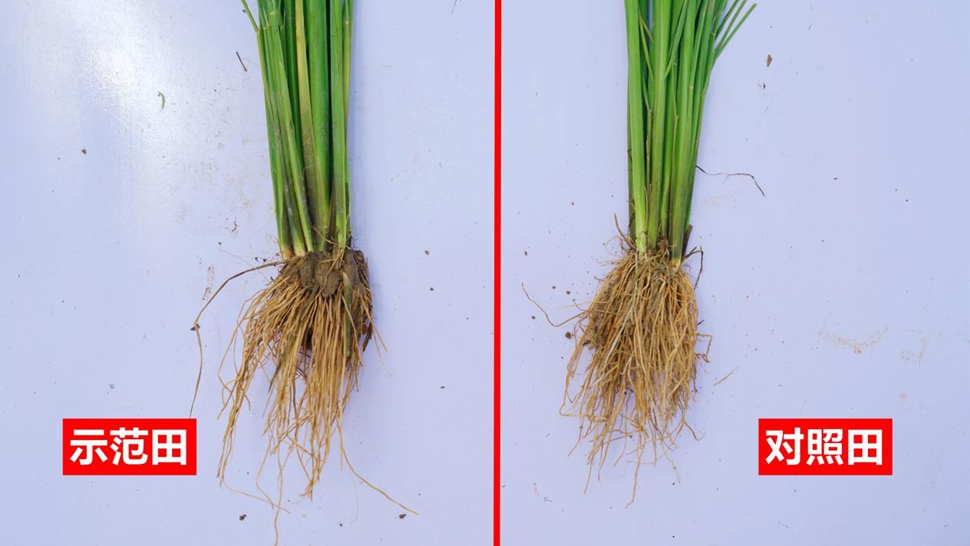 示范田水稻茎秆直径较对照田平均增加0.8-1.2毫米,质地更坚韧;有效分蘖数较对照田更多。分蘖数量的优势为后期多穗、大穗奠定基础。