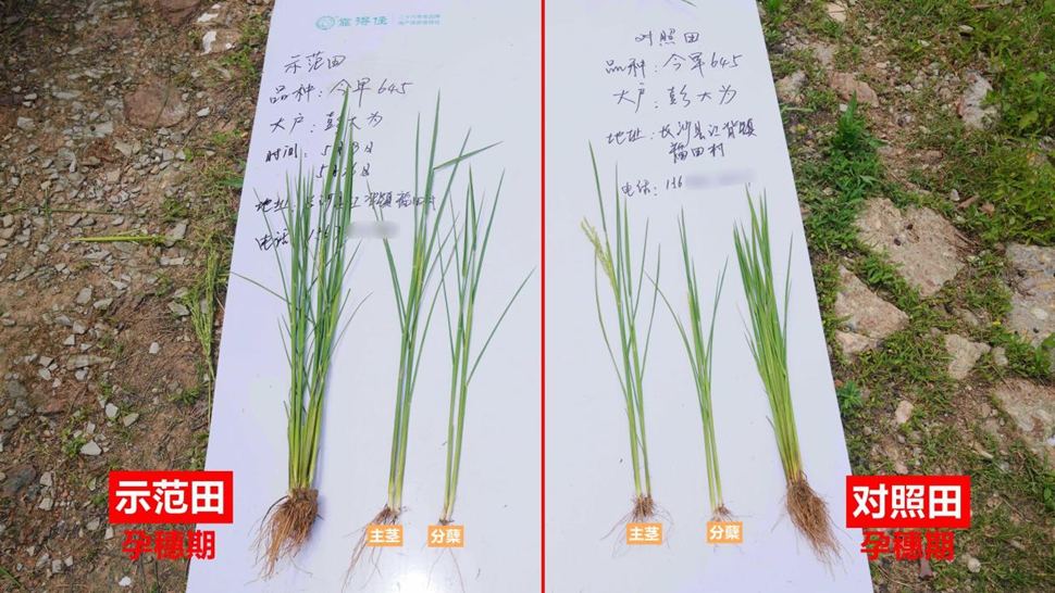 从生长阶段看,示范田水稻仍处于孕穗期(幼穗分化关键期),而对照田部分主穗已进入抽穗阶段。