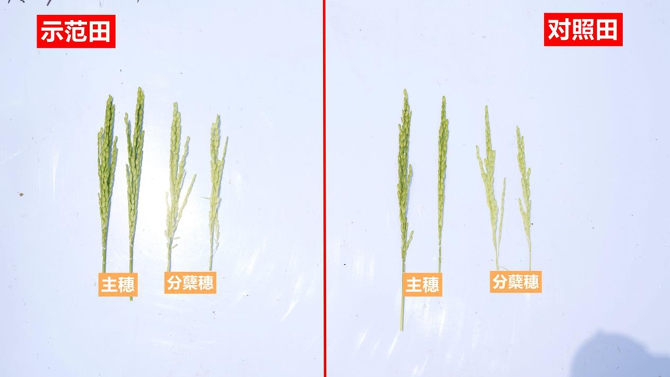 通过剥出稻穗进行观测,示范田稻穗外壳更厚实、色泽鲜绿,捏取时触感充实;对照田稻穗壳层偏薄,部分籽粒位置可见凹陷痕迹。