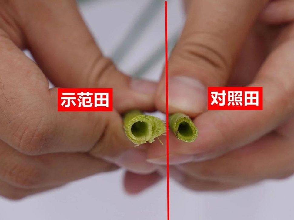 ★示范田:茎秆发育更充分,厚壁细胞层,手感更坚韧,横切面可见更致密的维管束(输送养分的“管道系统”);