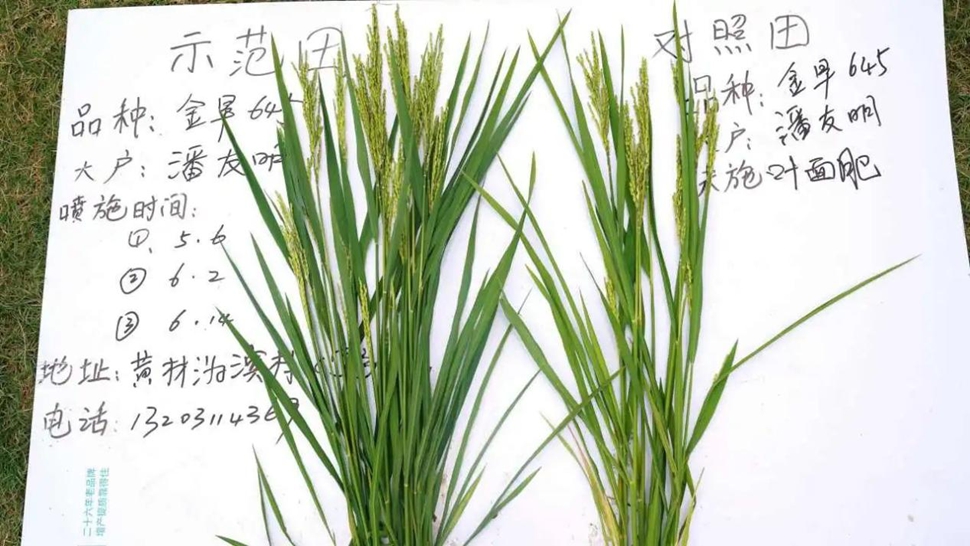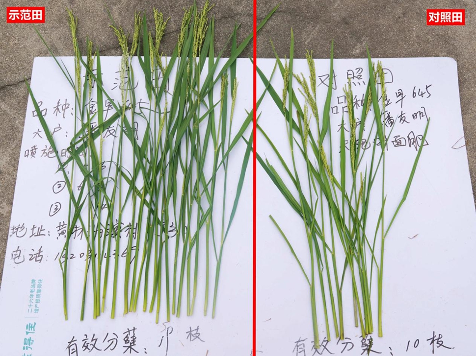 宁乡市黄材镇沩滨村,6月,种粮户潘大哥种植的“今早645”水稻进入抽穗期(水稻生殖生长关键阶段)。其中分出一块田喷施“靠得住”水稻增产方案的示范田,与传统管理对照田,在形态建成指标与生理功能上呈现显著差异,为“靠得住”肥效提供了直观的田间证据。