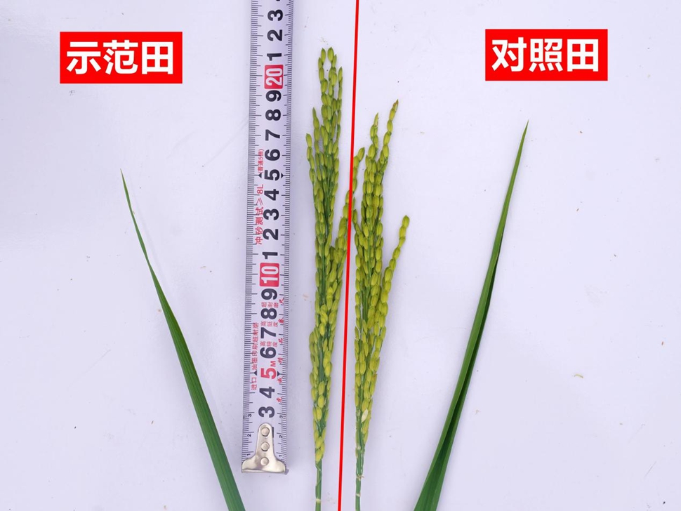 从穗部表现看:示范田主穗与分蘖穗均穗轴粗壮、颖花(未来籽粒)排列紧密,无顶部空瘪现象;对照田部分穗顶部出现颖花退化(未发育完全的空粒),穗型偏短小。